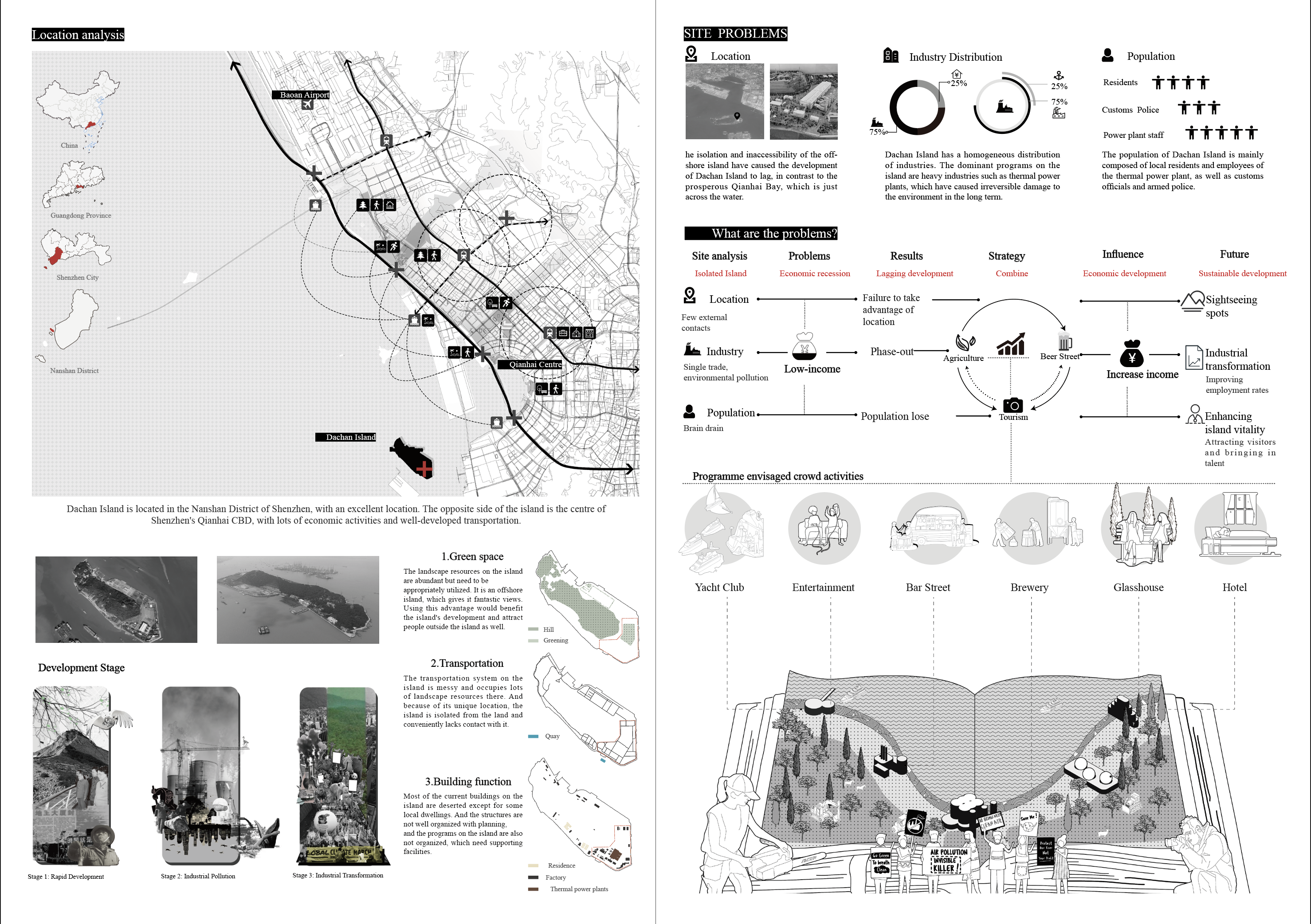 This project is an urban regeneration initiative located on Dachan Island, the second-largest island in Shenzhen, China. The site previously housed a thermal power plant. Dachan Island, once a vital heavy industry hub, has witnessed the rapid transformation of Shenzhen. However, the dominant industrial activities on the island have left a detrimental impact on its ecological environment. With the thermal power plant now abandoned, the island lacks vibrancy. Additionally, due to its isolated location, Dachan Island struggles to keep pace with the city's development, creating a stark contrast to the nearby Qianhai Free Trade Zone across the sea. Consequently, the island has experienced population decline, worsening environmental conditions, and economic stagnation.